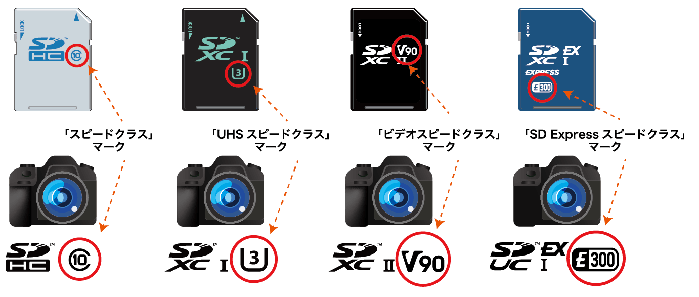 スピードマークには、スピードクラス*、UHSスピードクラス**、ビデオスピードクラス***、SD Expressスピードクラス****の4種類があり、マークに数値を組み合わせて最低限の書込みスピードを表しています。主にカムコーダー、ビデオレコーダーおよびビデオ録画機能を備えたデバイスに有効な機能です。