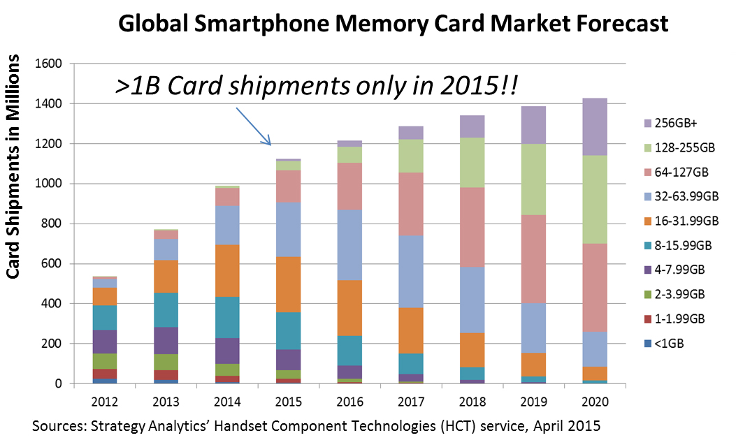microSD cards have come a long way. For example, the first microSD cards were introduced to the market as a new method for expanding mobile phone memory 10 years ago. Today, about 75 percent of smartphone models on the market contain microSD slots, according to data from Strategy Analytics. The report also reveals that several billion microSD cards have been sold since their initial release, and predicts that more than one billion will be sold this year.