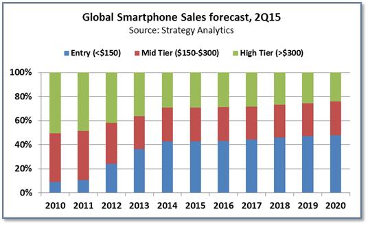 In the lower cost smart phone market – according to Strategy Analytics, the mid-tier and