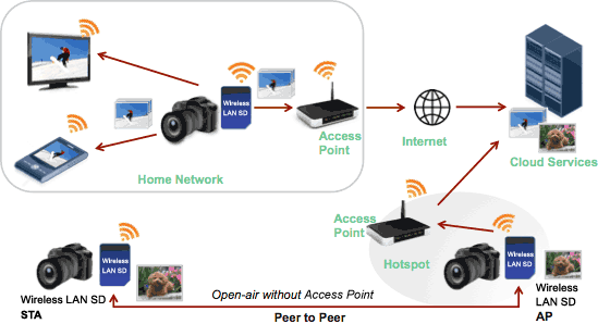 The Wireless LAN SD standard was developed as a new SD standard to enable devices mounted with IEEE 802.11 (a/b/g/n) to perform wireless communications between home networks, SNS and cloud services, and SD memory cards.